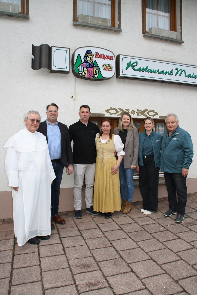 Oksana und Alexander Tannert führen den Betrieb seit 1. April und nahmen zur Eröffnung die Glückwünsche der Gemeinde und von Aktives Todtmoos entgegen. Pater Mirko sprach den Segen. Im Restaurant werden deutsche Küche und Grillspezialitäten wie etwa das Hans Thoma Pfännchen angeboten sowie ein wechselndes Tagesmenü. Sowohl in den Gaststuben als auch auf der großen Terrasse finden jeweils bis zu 100 Gäste Platz. Die Pächter legen wert auf einen regelmäßigen Stammtisch. Auch für Vereinsversammlungen und Familienfeiern bieten sich die Räumlichkeiten an. Das Hotel verfügt über 47 Betten. Die Familienmitglieder helfen im Betrieb mit. Geöffnet ist der Maien täglich ab 10.00 Uhr. Im Bild von links nach rechts: Pater Mirko, Bürgermeister Marcel Schneider, die Pächter Alexander und Oksana Tannert, Katharina Maier von der Touristinfo, Sabrina Klein und Frieder Maier von Aktives Todtmoos.Foto Andreas Böhm