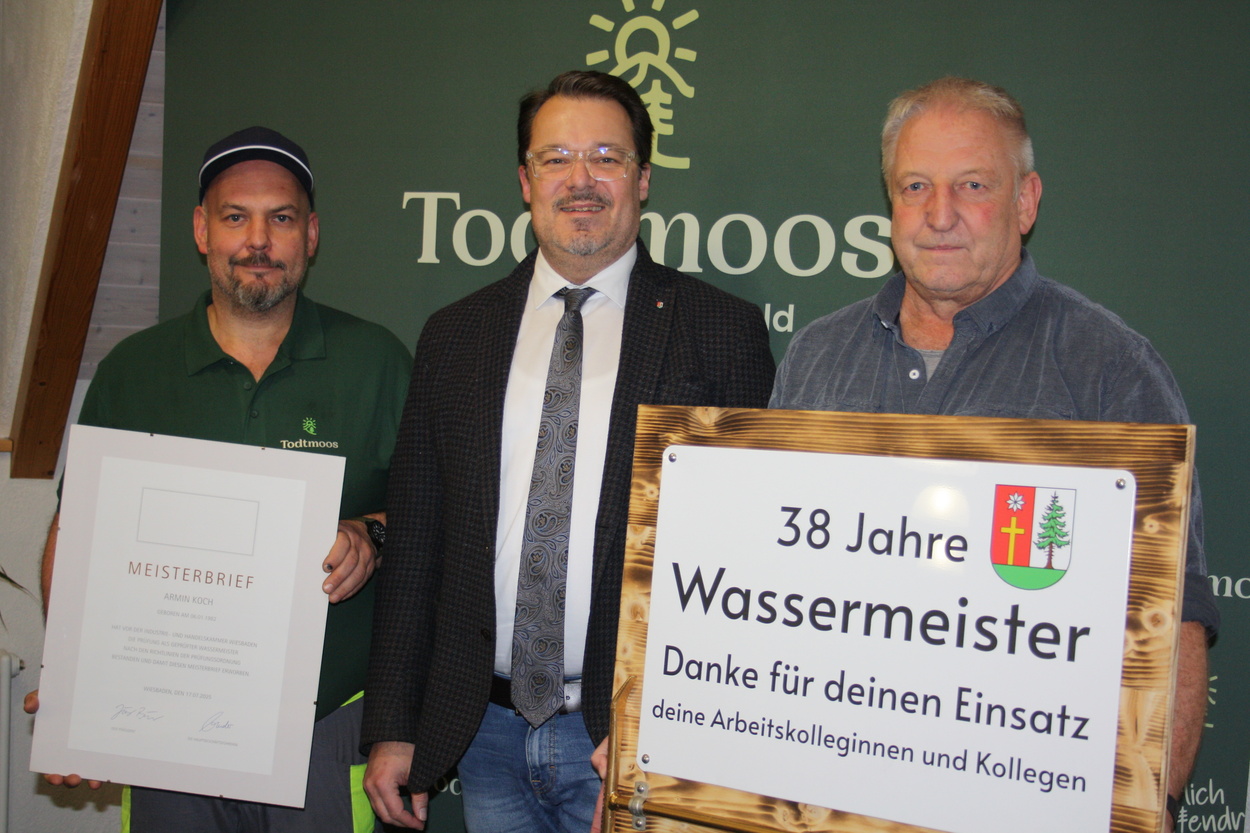 Bürgermeister Marcel Schneider hieß zugleich den neuen Wassermeister Armin Koch herzlich willkommen. Wolfgang Paul war der Herr über acht Hochbehälter, einen Tiefbrunnen und einige Pumpstationen. Er betreute knapp 60 Kilometer Hauptleitung im Bereich der Trinkwasserversorgung. Zu seinen Aufgaben gehörte die Überwachung des weit verzweigten Netzes und dessen Wartung. Paul war auch für die Wasserqualität verantwortlich und musste so manchen Rohrbruch finden. Zudem war der Wassermeister Ansprechpartner für die Anschlussnehmer. Bürgermeister Marcel Schneider: „Wolfgang Paul war bei vielen Projekten federführend und hat kostengünstige Ansätze realisiert. Die gute Wasserversorgung in Todtmoos ist sein Verdienst“. Paul war auch Leiter der Eigenbetriebe und stellvertretender Bauhofleiter. Der neue Wassermeister Armin Koch erhielt im Sommer seinen Meisterbrief nach erfolgreicher Prüfung vor der Handwerkskammer Wiesbaden. Armin Koch bringt somit beste Voraussetzungen für die anspruchsvolle Aufgabe in Todtmoos mit.
